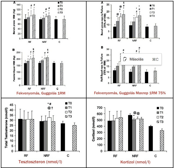 Egy 16 hetes periódus (T0=kezdéskor, T1=6 hét edzés után, T2=11 hét edzés után, T3=16 hét edzés után) alatt 3 csoport (RF=bukásig edzők, NRF=nem bukásig edzők, C=kontroll csoport) erejét és hormonális változásait vizsgálták.