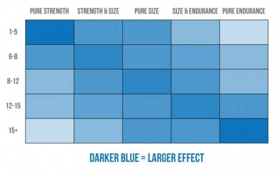 Számunkra a második oszlop (erő+izomnövelés) talán a legfontosabb: ebből a tekintetből talán a 6-8 ismétlés a legjobb, de hasonlóan nagy hatása van az 1-5 és a 8-12-nek is erre.