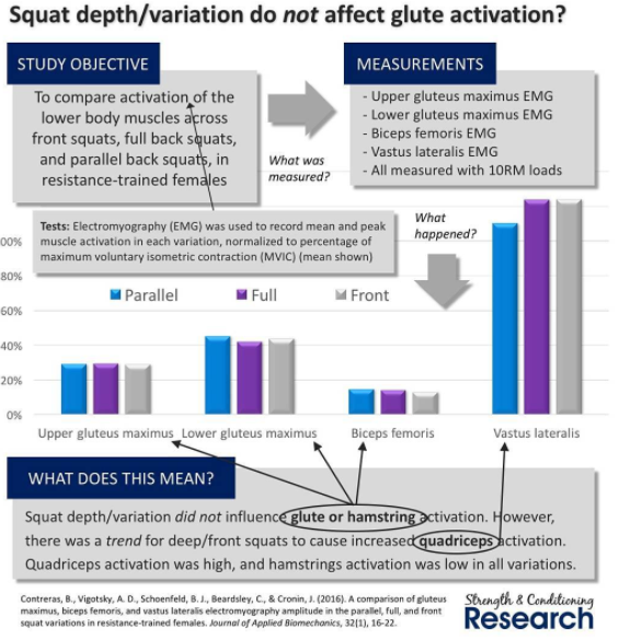 A mérések is ezt igazolják: Beardsley tanulmányából (ennek összegzését a képen láthatod) jól látszik, hogy a guggolás mélységtől függetlenül a combhajlítók aktivációja jelentősen kisebb, mint a combfeszítőké és farizmoké. Sőt, egy egyszerű lábhajlító gépes gyakorlatban a guggolásnál háromszor (!) nagyobb izomfeszülést idézhetünk elő a hajlítókban.