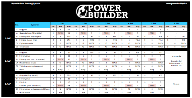 A program célja az erőemelő fogásnemekben (guggolás, fekvenyomás, felhúzás) való erősödés, ezek technikájának fejlesztése és egy kiegyensúlyozott fizikum építése.