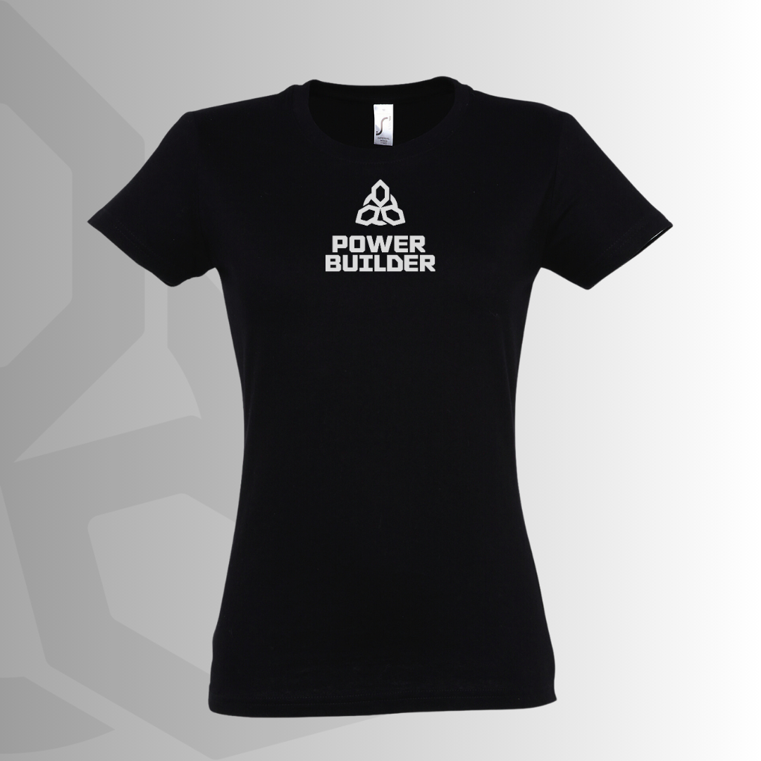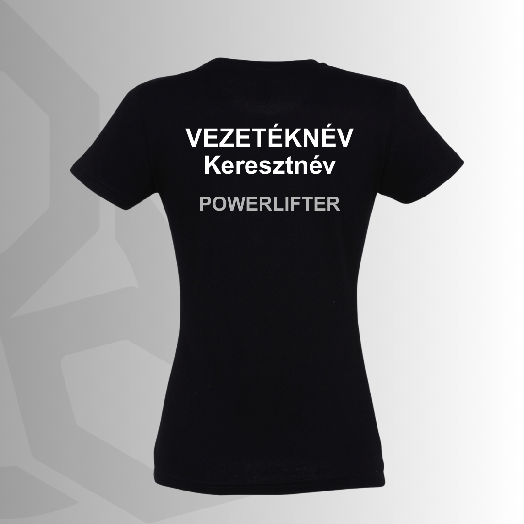 Versenyzői póló elöl kis PWB logóval, hátul névvel és „POWERLIFTER” felirattal.